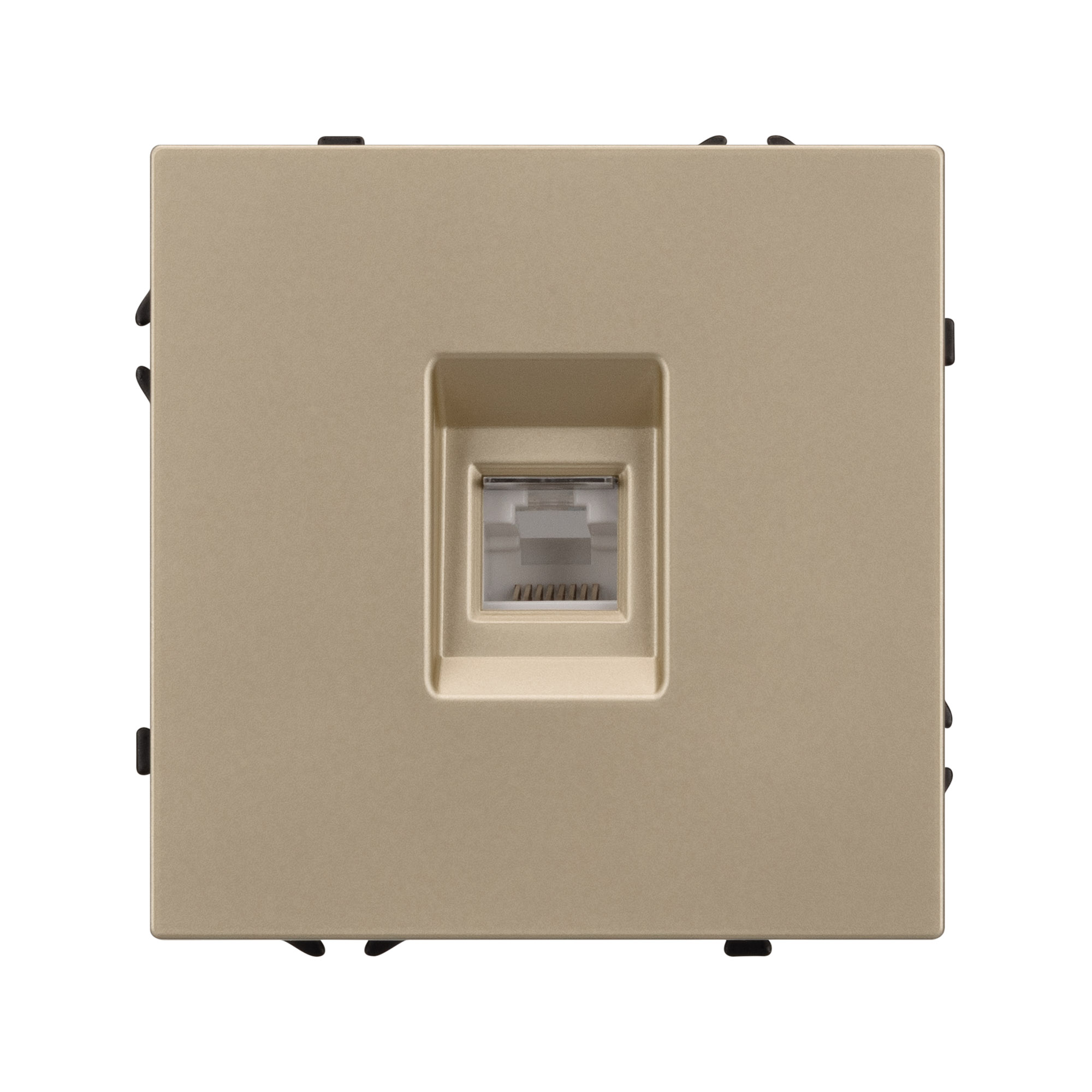 Механизм компьютерной розетки на 1 пост 6-й категории. Цвет - золотой, с Soft-Touch покрытием. Без фронтальной рамки. Уровень пылевлагозащиты IP20. Тип подключаемого разъема - RJ45. Розетка устанавливается в стандартный подрозетник круглого сечения диаметром 60мм.