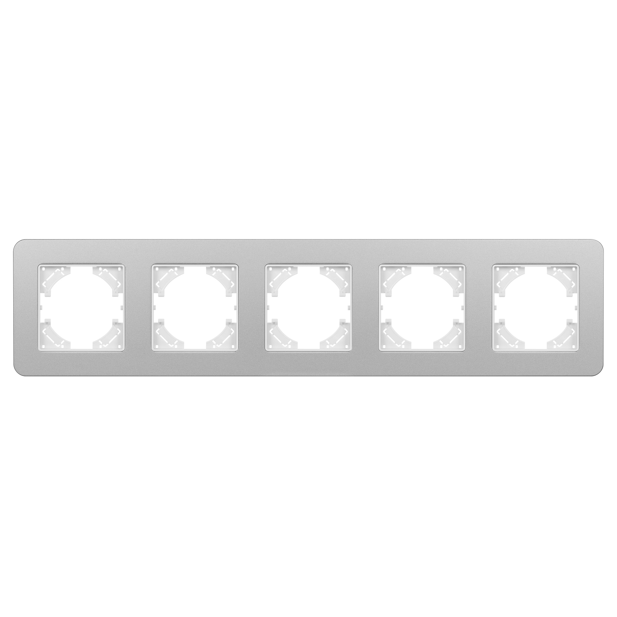 Рамка алюминиевая на 5 постов, под встраиваемый механизм. Цвет - серебристый с Soft-Touch покрытием. Среднего уровня герметичности IP20. Ориентация монтажа - горизонтальная (основным ориентиром служат посадочные выступы для накладки механизма).