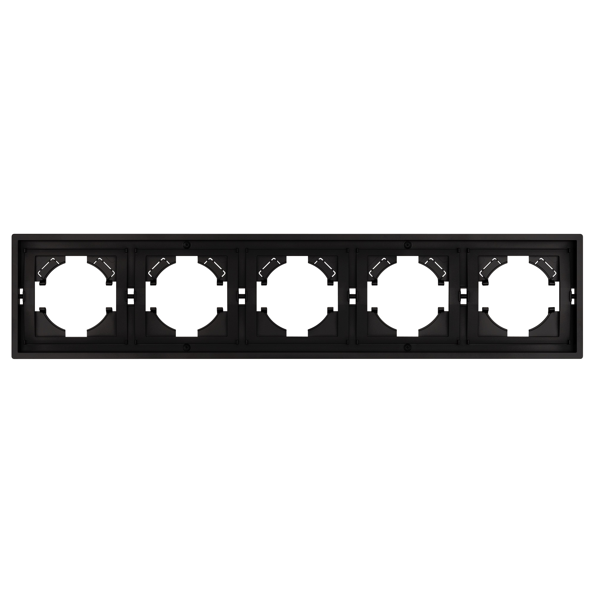 Рамка пластиковая на 5 постов, под встраиваемый механизм. Цвет - черный. Среднего уровня герметичности IP20. Ориентация монтажа горизонтальная.
