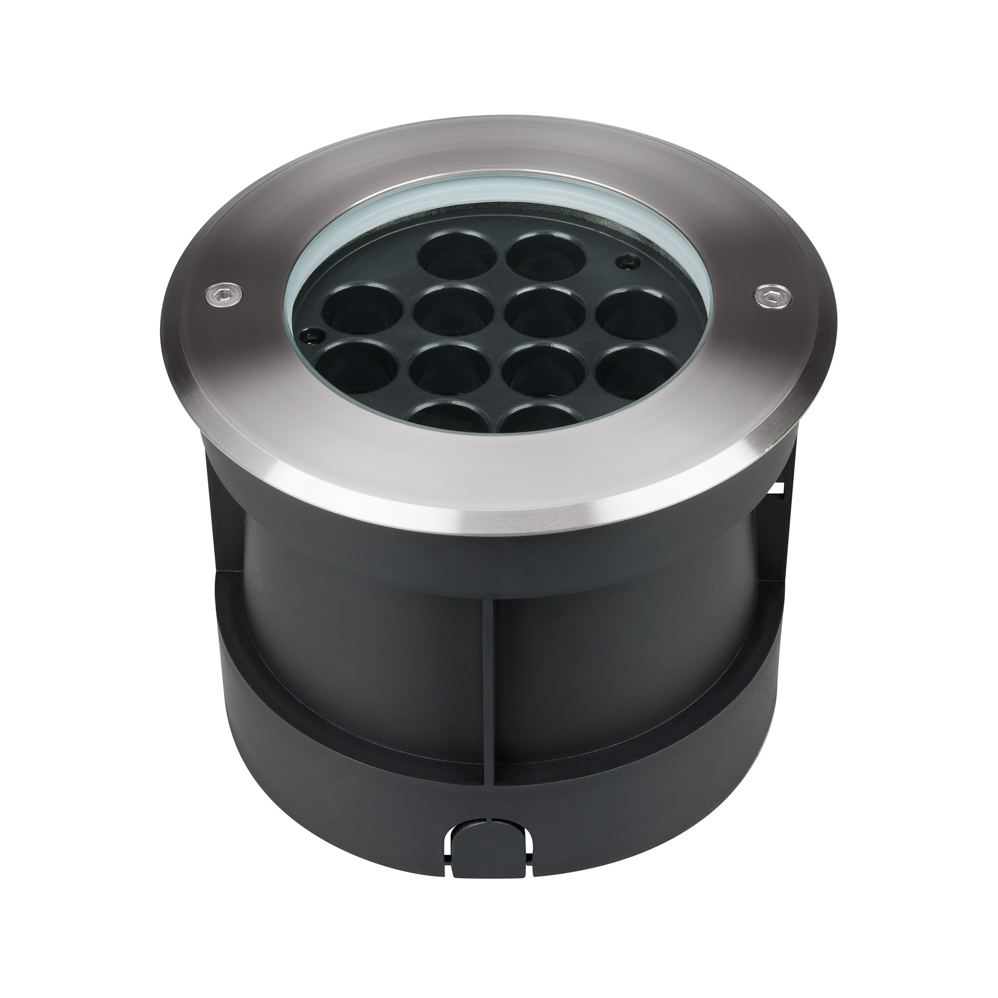 Встраиваемый светодиодный светильник для грунта и пола. Мощность 25 Вт, световой поток 2157 лм, цвет теплый 3000К. CRI(Ra)>80, угол 35°. Круглый влагозащищенный корпус IP67, нержавеющая сталь. Экран закалённое стекло. Питание 230В, 25Вт. Размер DxH Ø180x140мм. Установка в отверстие DxH Ø166x137мм.