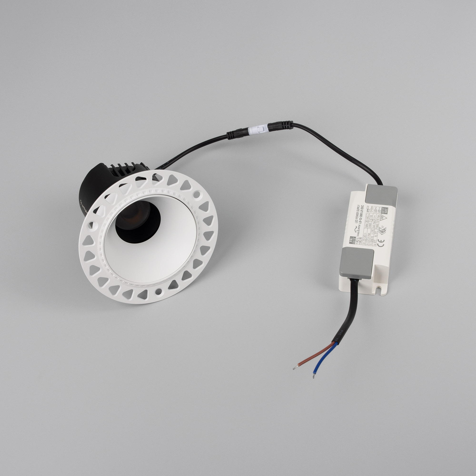 Встраиваемый светильник даунлайт. Мощность 12 Вт, св. поток 905 лм, 75 лм/Вт, теплый 3000 K, CRI>92, угол 55°, напряжение питания 230 В. Белый круглый корпус из алюминия, белый матовый отражатель, степень защиты IP20 . Размер: диаметр 105 мм, высота 87 мм. Монтаж встраиваемый, установочное отверстие: диаметр 75 мм. Драйвер 27-42 В, 280 мА, пульсация <0,5%.