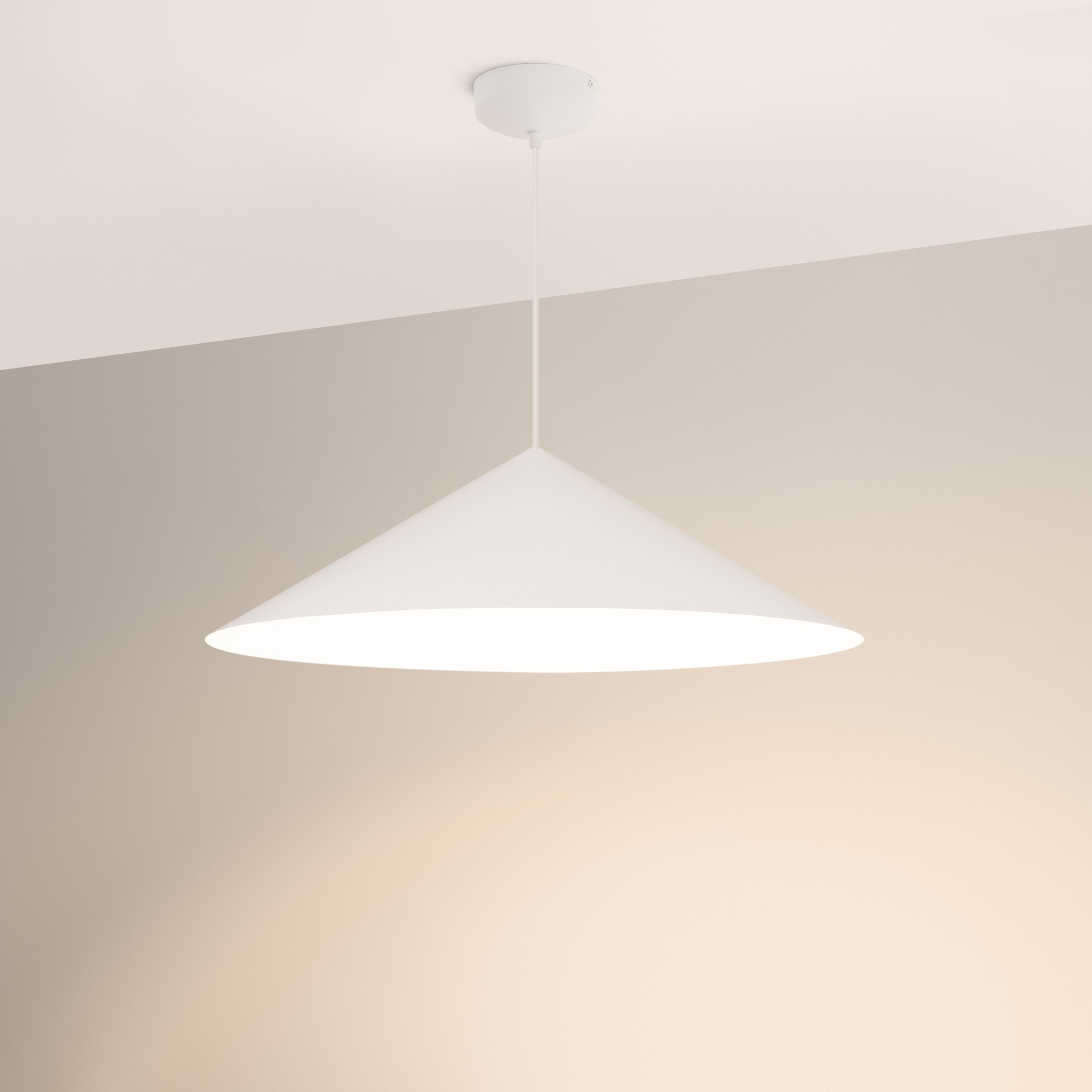 Подвесной светильник. Мощность 14 Вт, св. поток 1200 лм, 90 лм/Вт, теплый 3000 K, CRI>92, угол 36°, напряжение питания 230 В. Белый корпус из алюминия в форме конуса с белой внутренней поверхностью, линза-рассеиватель из PMMA, степень защиты IP20. Размер: диаметр 750 мм, высота 230 мм. Монтаж подвесной, длина подвеса 2000 мм, регулируемая. В комплекте 2 вида чаш. Габариты встраиваемой чаши: Ø 80x23 мм. Габариты накладной чаши Ø140x55 мм. Драйвер 27-42 В, 350 мА, пульсация <1%. Управление по TRIAC.